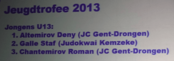 Vrijdag 17 januari worden twee van onze X-team judoka's gehuldigd op de Algemene vergadering van Oost-Vlaanderen in Berlare. Deny is immers er in geslaagd in 2013 de eerste plaats te behalen op de ranking van de U13 in Oost-Vlaanderen. Maar ook de derde plaats wordt ingenomen door een judoka van ons X-team, nl Roman.